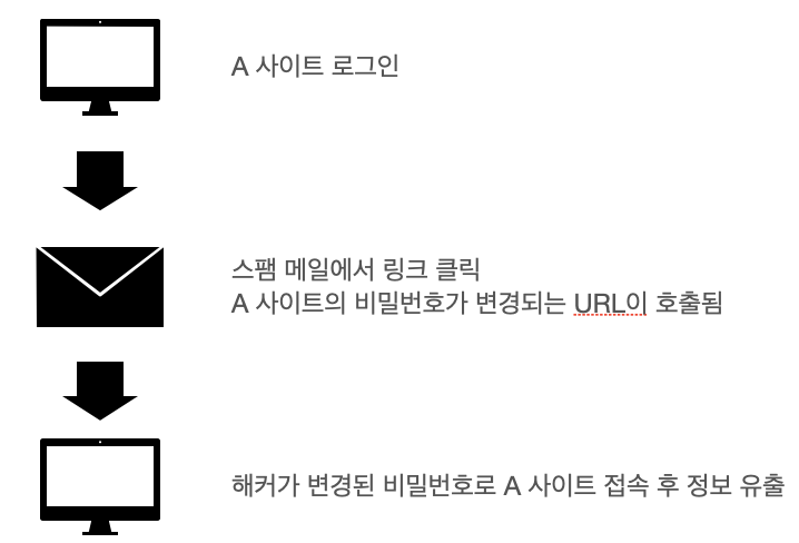 특정 사이트에 로그인 된 상태에서 해커가 보낸 스팸 메일의 링크를 클릭하게되면 해커가 지정한 비밀번호로 변경하는 A 사이트의 URL 이 호출된다